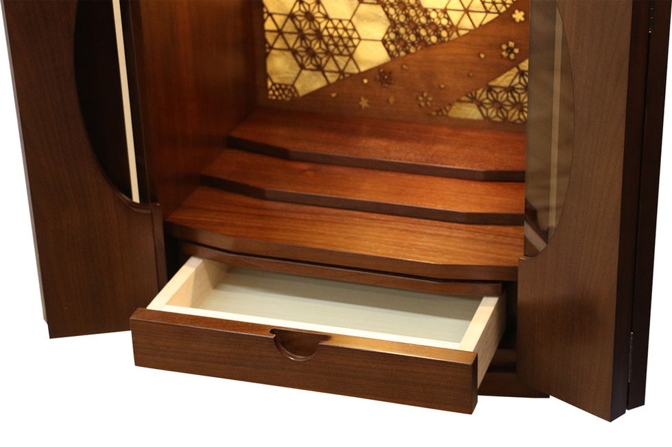 ガラスがはめ込まれた扉は綴じても中を見ることが出来ます。背板の細工が美しいお仏壇です。
