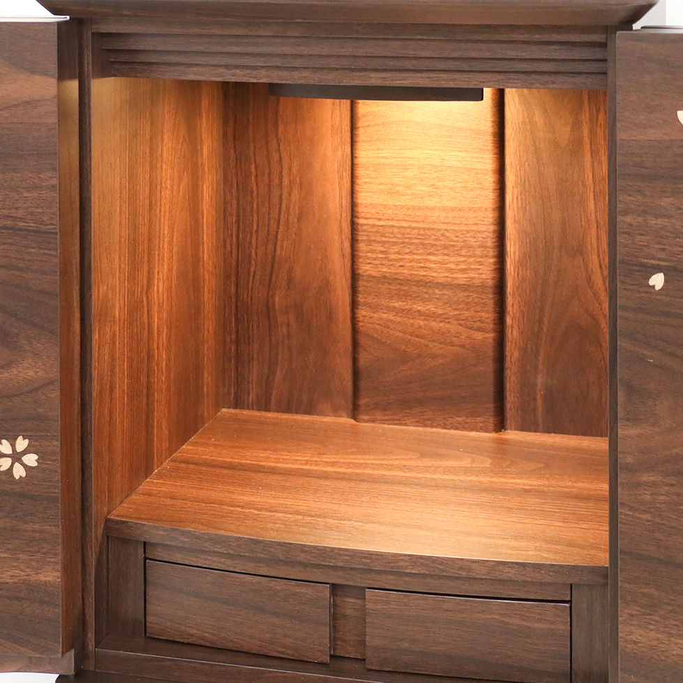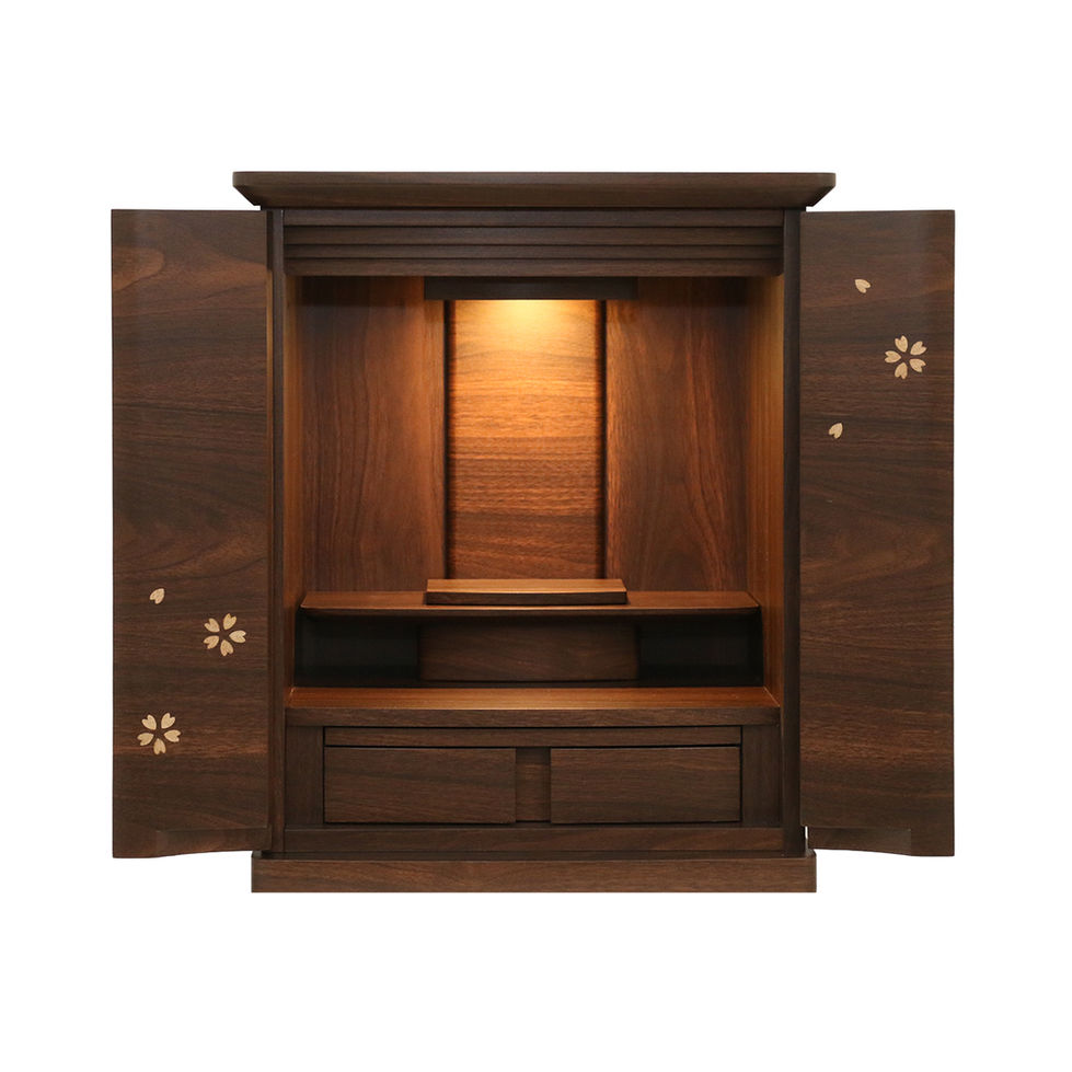 秋桜16号は、コンパクトなサイズでありながら、美しい仏壇をお探しの方に最適な製品です。ウォールナットの突板仕上げで見た目は無垢材のようでありながら反りや変形も少なく、上品な雰囲気を演出します。桜の花びらをあしらったデザインがお部屋に和やかな雰囲気をもたらします。16号の大きさは、適度に存在感がありながらも窮屈に感じることなく、どんな場所にも合わせやすいサイズです。