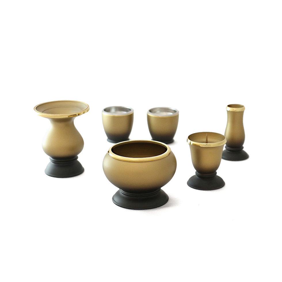 丸みを帯びた柔らかいデザイン、優しいフォルムでモダンな仏壇に合わせやすいデザインとなっています。花立て・香炉・火立て・茶湯器・仏飯器・線香差しの6点セットです。 表面材:真鍮 サイズ(花立て):幅7.1×奥行7.1×高さ8.6cm サイズ(香炉):幅8.6×奥行8.6×高さ6.3cm サイズ(火立て):幅5.0×奥行5.0×高さ6.0cm サイズ(茶湯器):幅4.8×奥行4.8×高さ4.5cm サイズ(仏飯器):幅4.8×奥行4.8×高さ4.5cm サイズ(線香差し):幅4.0×奥行4.0×高さ7.0cm