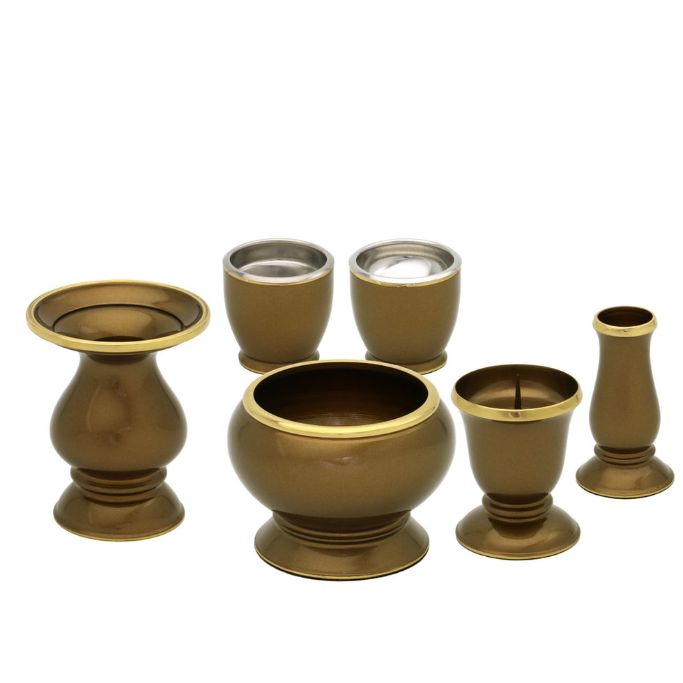 丸みを帯びた柔らかいデザイン、優しいフォルムでモダンな仏壇に合わせやすいデザインとなっています。花立て・香炉・火立て・茶湯器・仏器・線香差しの6点セットです。 表面材:真鍮 サイズ(花立て):幅7.1×奥行7.1×高さ8.6cm サイズ(香炉):幅8.6×奥行8.6×高さ6.3cm サイズ(火立て):幅5.0×奥行5.0×高さ6.0cm サイズ(茶湯器):幅4.8×奥行4.8×高さ4.5cm サイズ(仏飯器):幅4.8×奥行4.8×高さ4.5cm サイズ(線香差し):幅4.0×奥行4.0×高さ7.0cm